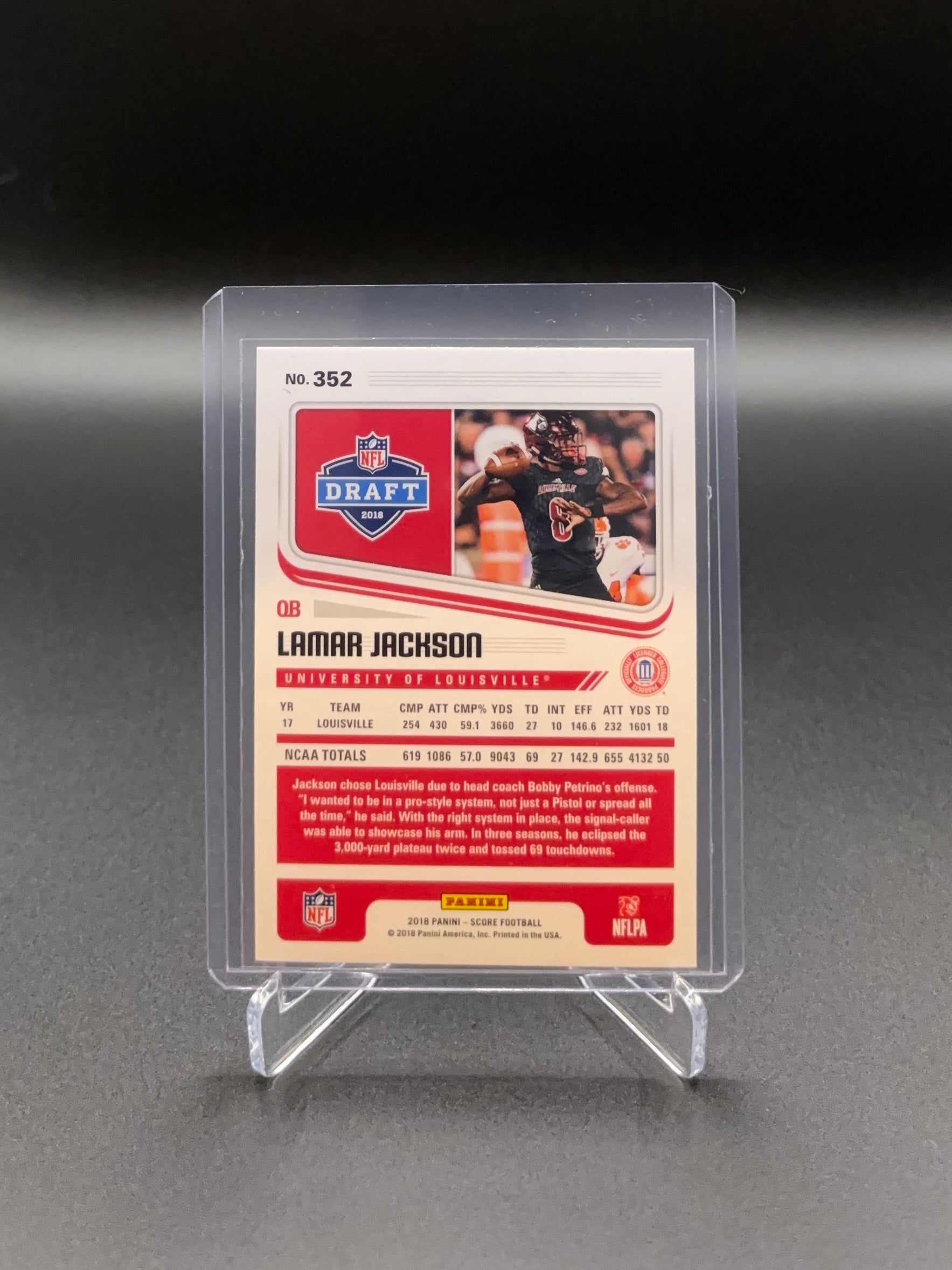 This is a raw (ungraded) 2018 Panini Score #352 rookie card of Lamar Jackson — a must-have for Ravens fans and collectors of elite quarterbacks.